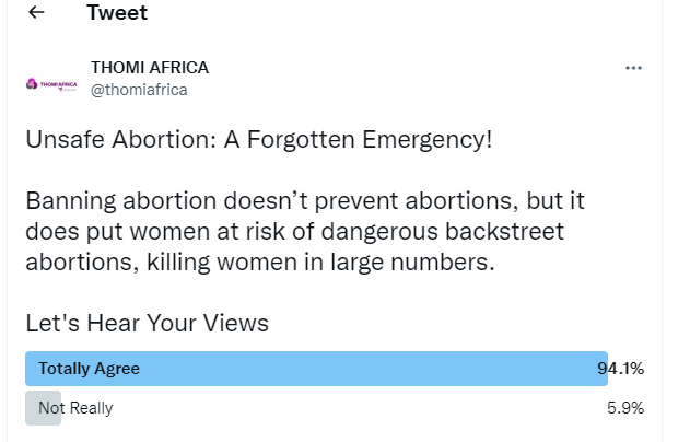 One of the non-governmental organizations that advocates, train, and raise awareness about unsafe abortion- THOMI Africa, recently conducted an opinion poll on Twitter if banning abortion prevent abortion from taking place, 94.1% t agreed that banning abortion doesn’t prevent abortions, but it does put women at risk of dangerous backstreet abortions, killing women in large numbers. As some west African countries still ban abortion, such as Nigeria where abortion is illegal and carries a heavy jail sentence-up to 14 years imprisonment- unless it is performed to save the life of the pregnant woman.