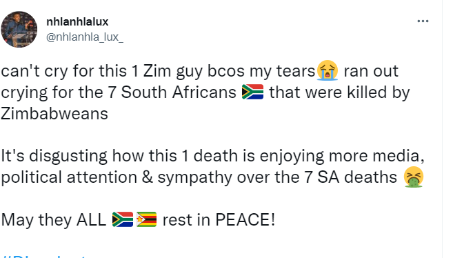 Nhlanhla Lux Dlamini has indicated that he can not cry for one Zimbabwean guy, Elvis a Zimbabwean national Elvis Nyathi who fell victim to the mob because his tears ran out crying for 7 South Africans that were killed by Zimbabweans. Dlamini is blaming the media for the bias.