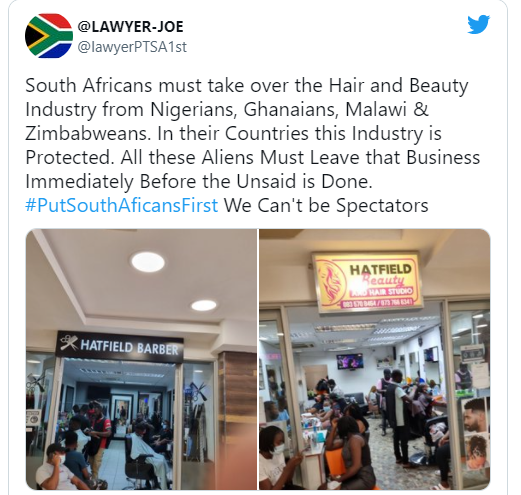 A Twitter user, who refers to himself as Lawyer Joe, has taken the situation a step further and called for foreigners from Nigeria, Ghana, Malawi, and Zimbabwe to be banned from running businesses in the hair and beauty industry.