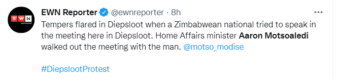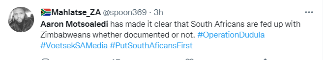 Some South Africans that attended the stakeholders meeting in Diepsloot on the 8th of April 2022 indicated that they are fed up with Zimbabweans whether documented or not. Some twitter users also echoed the same sentiments;